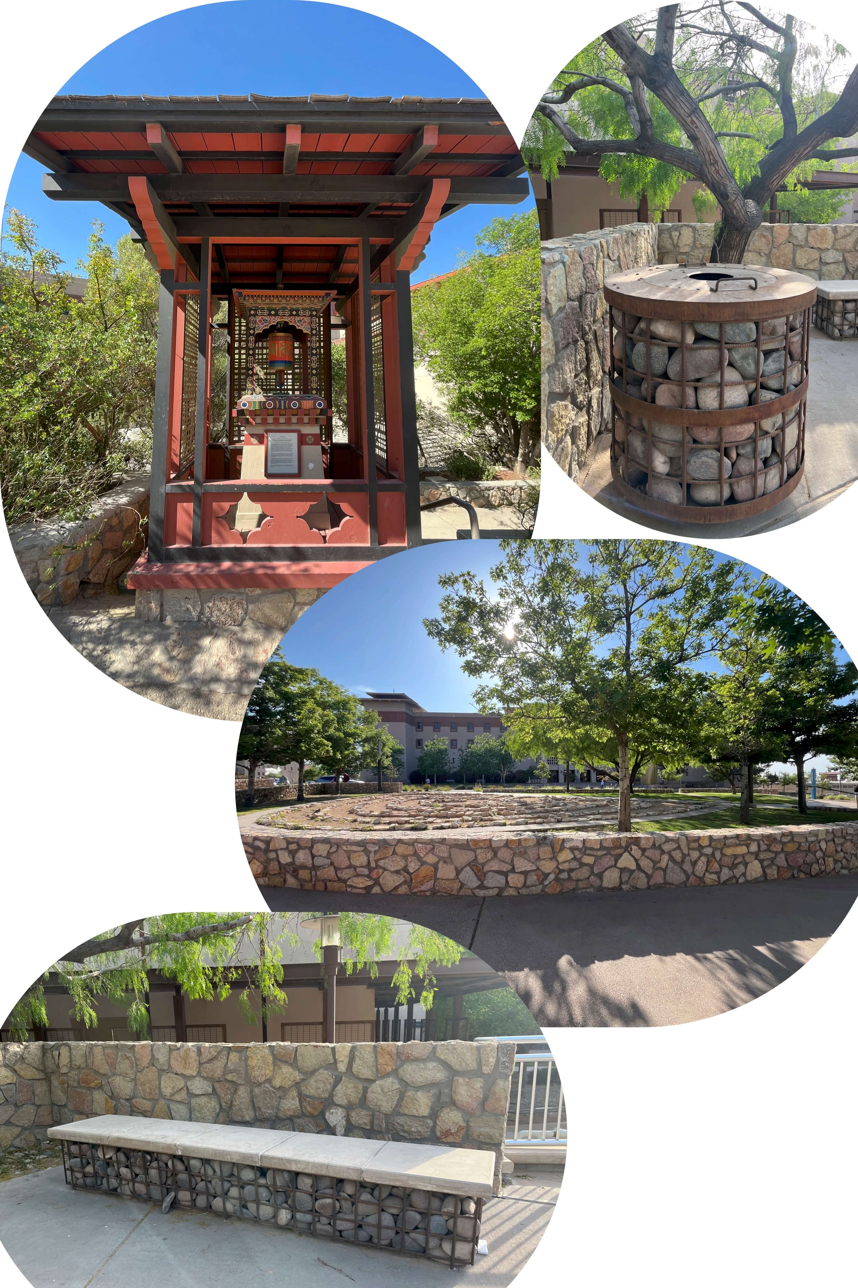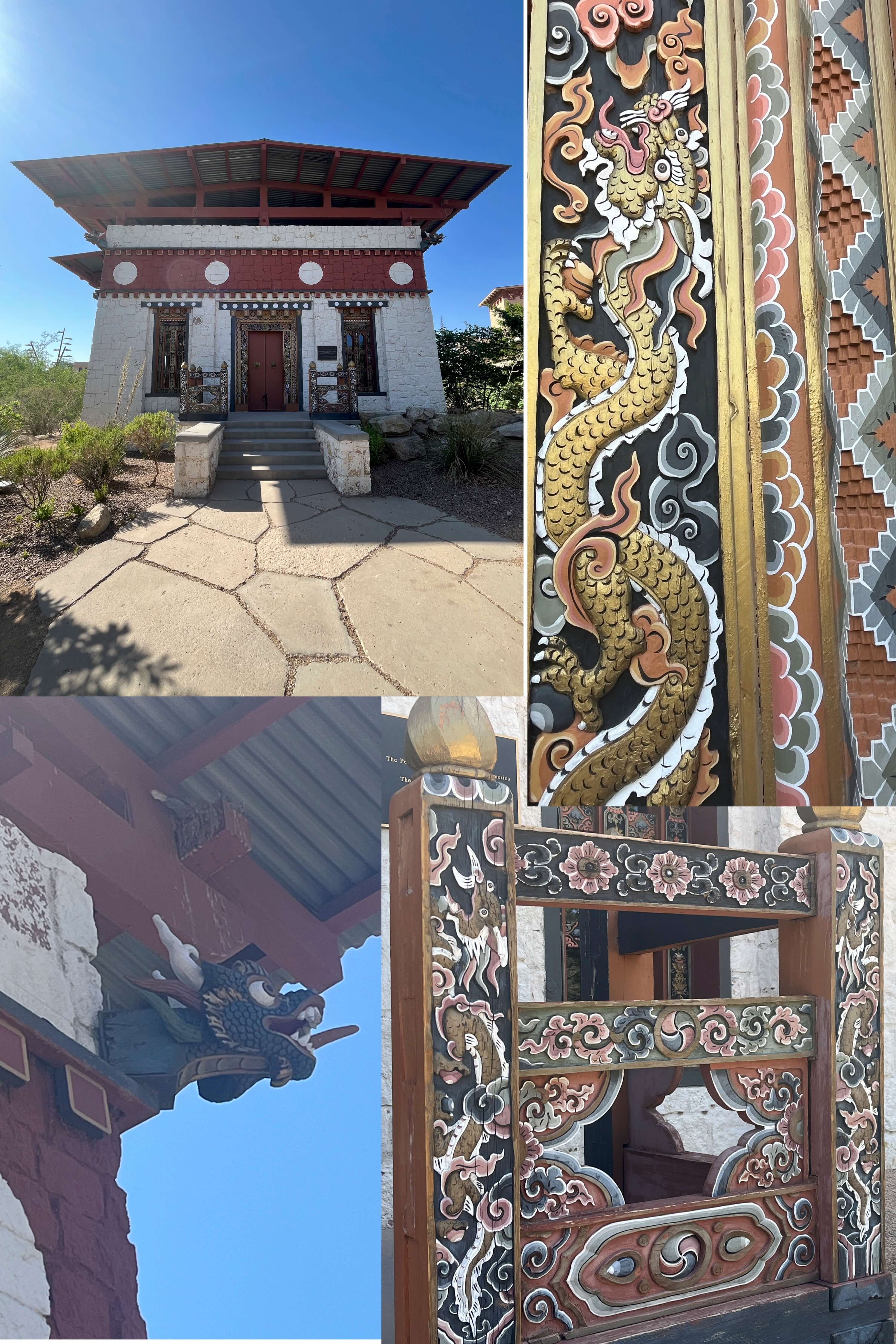 这座 Lhakhang 是不丹政府赠与美国的礼物,由不丹工匠在 2008 年的史密森民俗节(Smithsonian Folklife Festival)上建造,后来由 UTEP 接收并在校园内重新搭建保留。走近这座建筑,最先映入眼帘的是它庄重规整的正立面:一扇朱红色的对开木门居中,两侧对称地分布着两扇高窄的窗户,整个立面被厚重的石墙包裹,显得沉稳而有分量。我特别拼接了一些局部细节的照片,希望能更清晰地展现这座建筑在工艺上的层次与美感。门框周围的装饰极为精美,雕刻着对称的龙纹与几何图案,层层叠叠的木构线条中交织着金色、黑色、红色与青灰色,色彩浓烈却不显杂乱。门前的栏杆同样雕饰繁复,龙、凤、祥云、花朵等传统图腾穿插其间。屋檐下还探出一条深绿色的龙头,仿佛在默默守护着整座殿堂。门上的金龙、栏杆上的祥云,以及整体对称的布局与讲究的中轴线,都让人不禁联想到中国古代建筑中的诸多元素。这种相似不仅是视觉上的重合,更源于两种文化在宗教信仰与象征体系上的内在一致。在异国他乡再次遇见这些熟悉的图案和结构,心中不免一动,那是一种久违的熟悉感,就像不经意间,在遥远的地方看见了与自己文化悄然对话的某种印记。